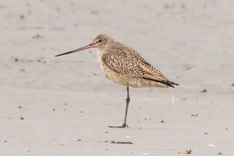 The Marbled Godwit is a graceful shorebird with warm cinnamon-brown plumage and a long, slightly upturned bill that gives it an elegant, refined look. Often seen wading through shallow waters, it sometimes rests while standing on one leg—a calm, balanced pose that highlights its long, slender form. It does this to conserve body heat and reduce muscle fatigue, tucking one leg close to its body to stay warm and comfortable while remaining alert.